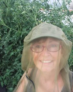 He is pictured here in all his romantic glory-this is the bouquet he presented his wifey-flags to mark the new asparagus bed! Julie is a former “library lady”, she is the gatherer of ideas, the dreamer, the list maker, and the adventurer (she also pulls a lot of weeds)! In this photo, she is clothed in her tomato and raspberry-picking (mosquito avoiding) gear.