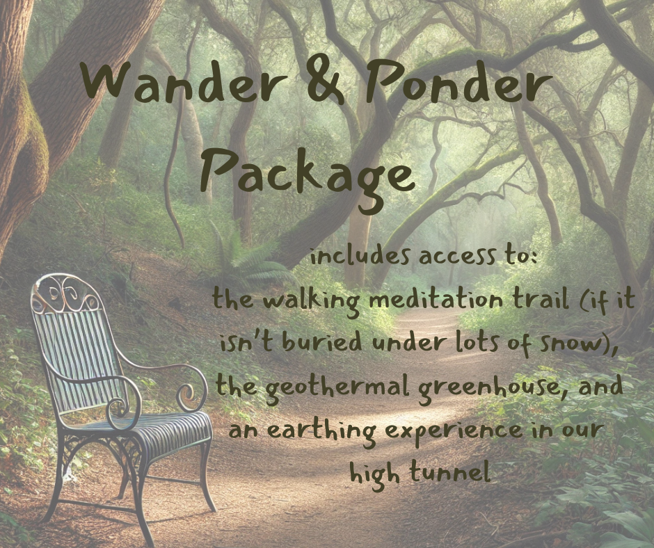 Introducing our Wander & Ponder package, designed to help you slow down, reflect, and recharge. Our trail features 8 “sit spots,” each with inspiring quotes and journaling prompts to guide your self-reflection. The quotes will be changed seasonally. As part of the package, you’ll receive a personal journal, exclusive access to the trail, and a chance to experience the ultimate in relaxation: our geothermal greenhouse—where temperatures reach 85 degrees even in the dead of winter—and our high tunnel set up for earthing.